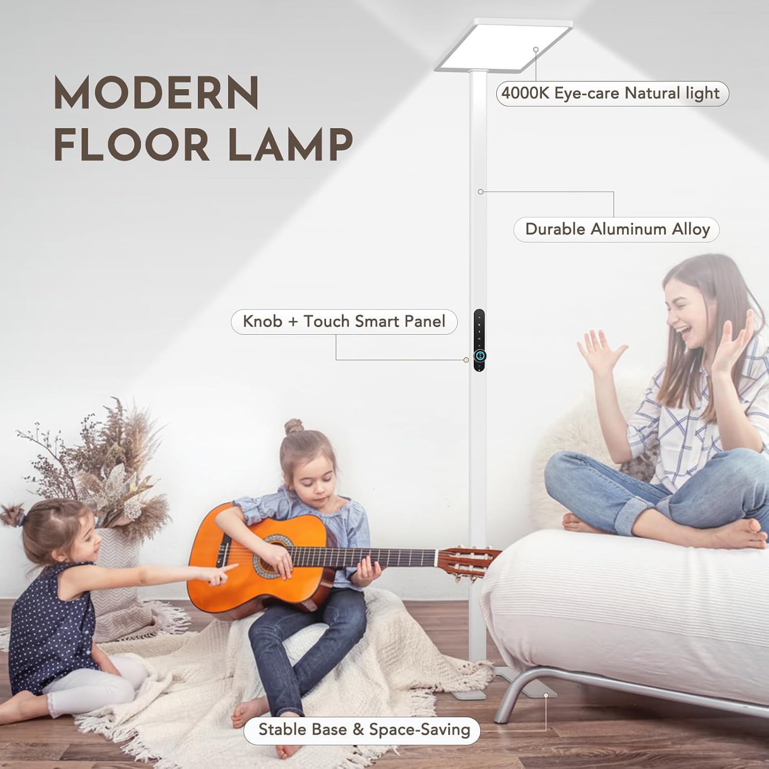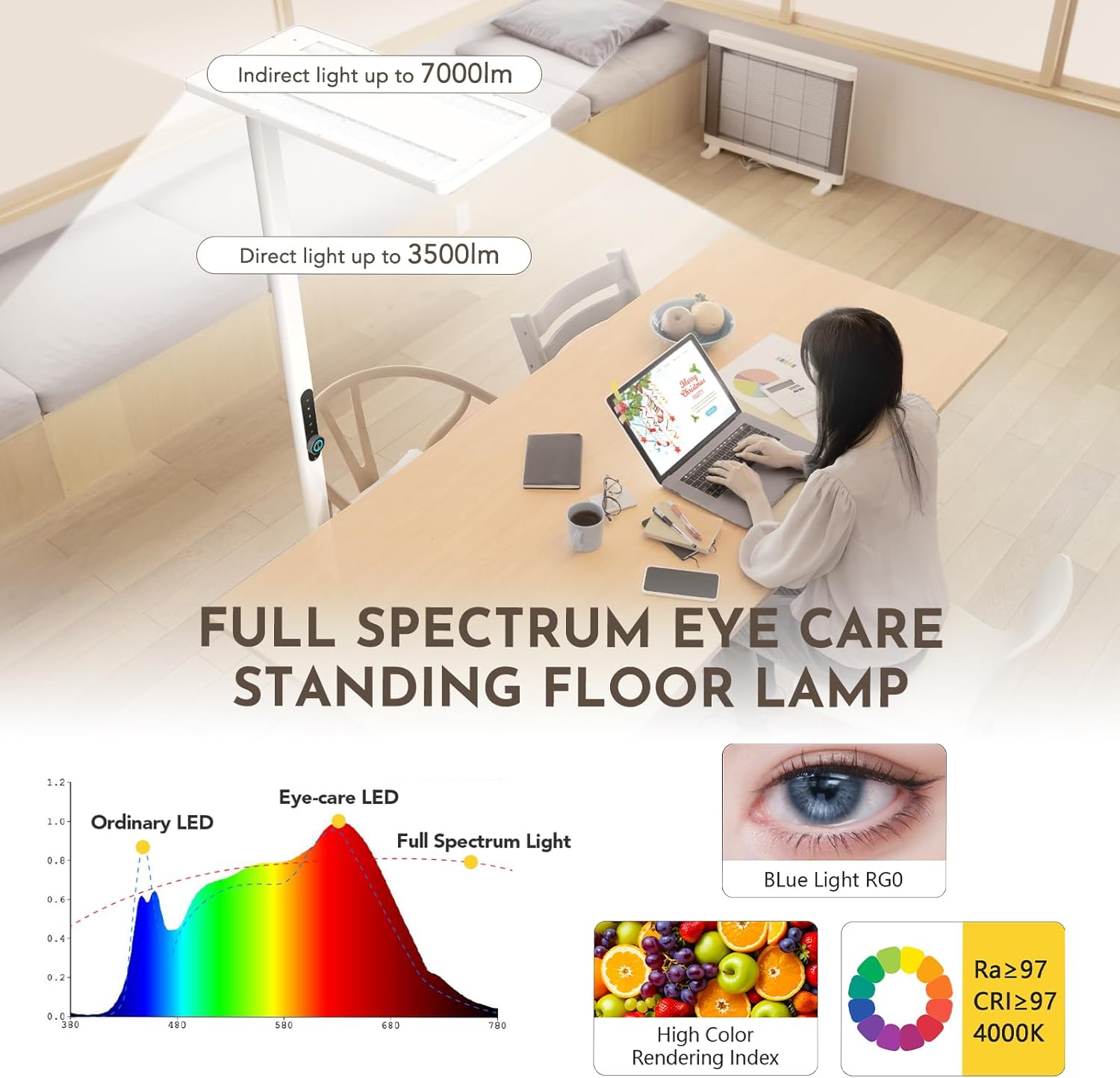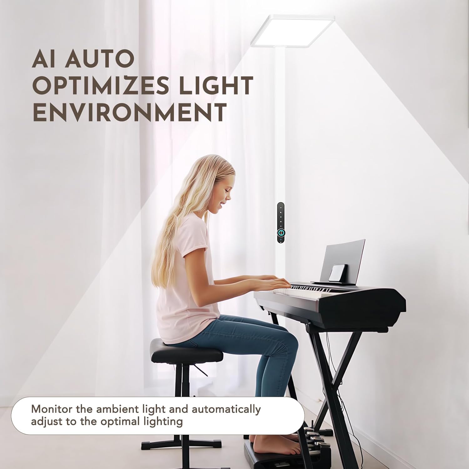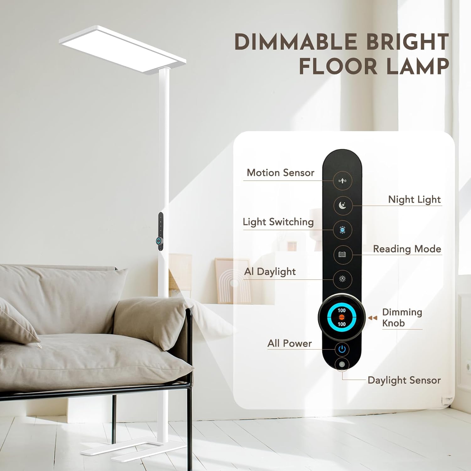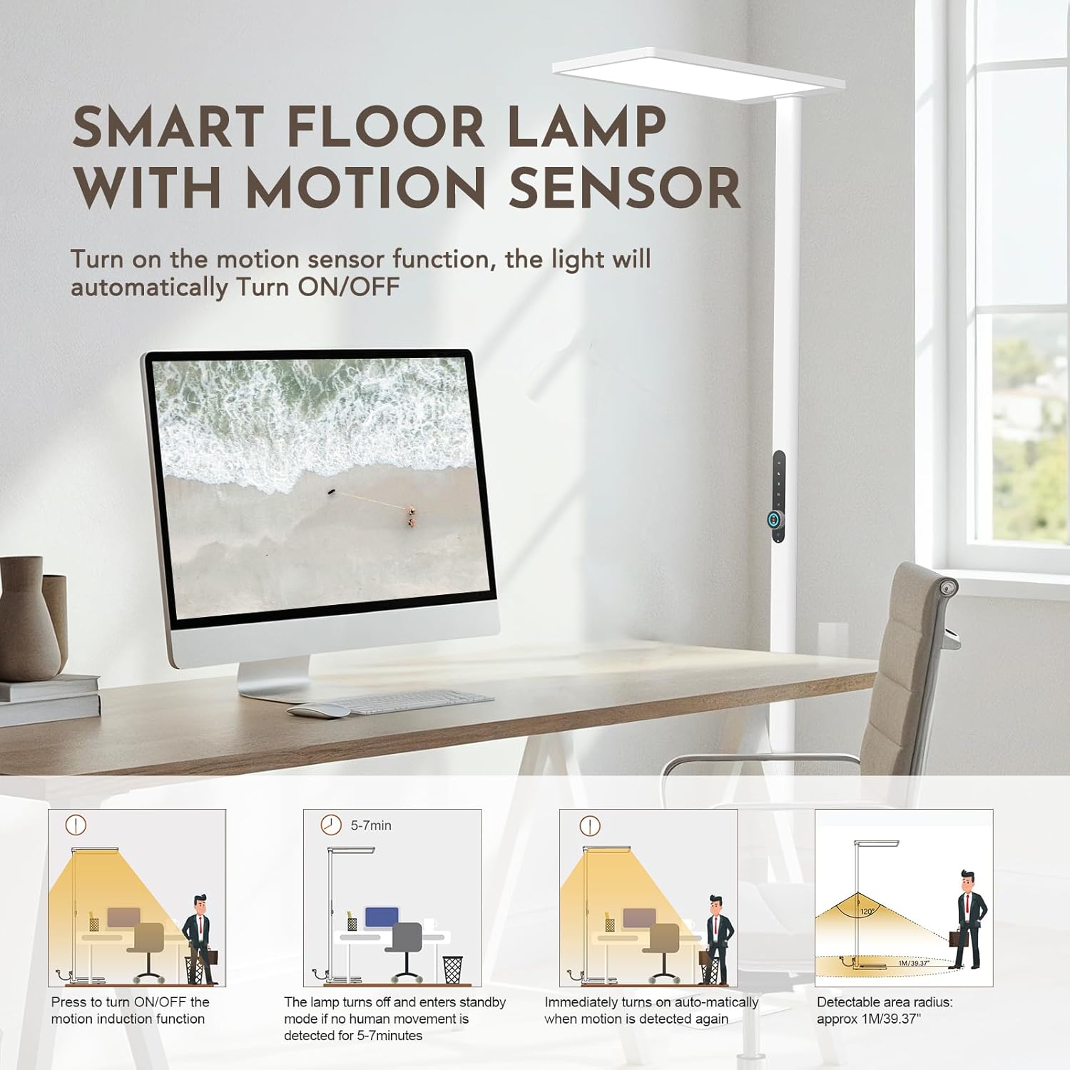 Diese LED Stehlampe mit 120W Leistung und Bewegungssensor bietet augenschonendes Vollspektrum-Licht für Lesen, Arbeiten und Lernen. Mit 10500 Lumen Helligkeit und 4000K Tageslicht sorgt sie für eine natürliche, gleichmäßige Ausleuchtung in Wohn- und Arbeitsbereichen.