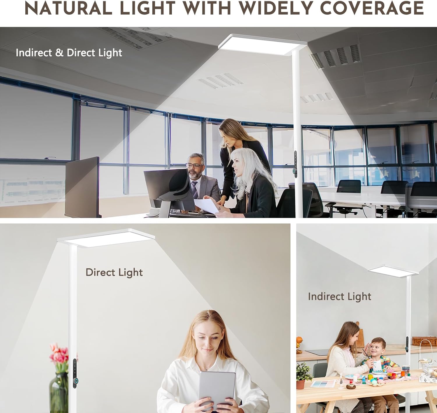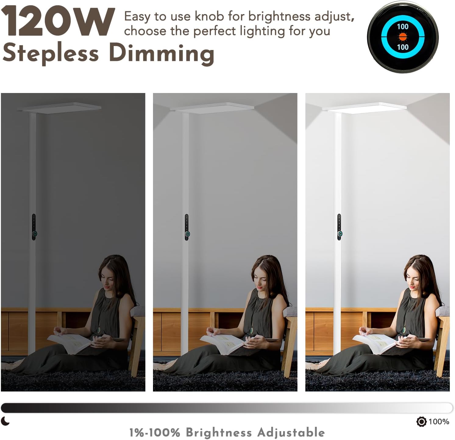Die Stehlampe bietet 3500 lm Direktlicht (50 W) und 7000 lm Indirektlicht (70 W) über ein Mikroprismen-Diffusorpanel. Der Drehknopf ermöglicht eine stufenlose Dimmung von 1 % bis 100 %. Über das Touchpanel lassen sich verschiedene Modi auswählen: Direktlicht, Indirektlicht, Kombimodus, Lesemodus (85 %) und Nachtlicht (10 %).