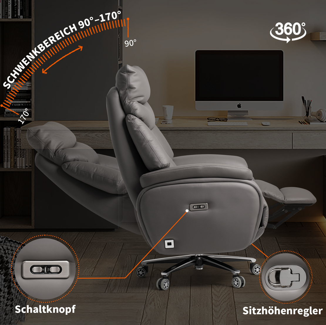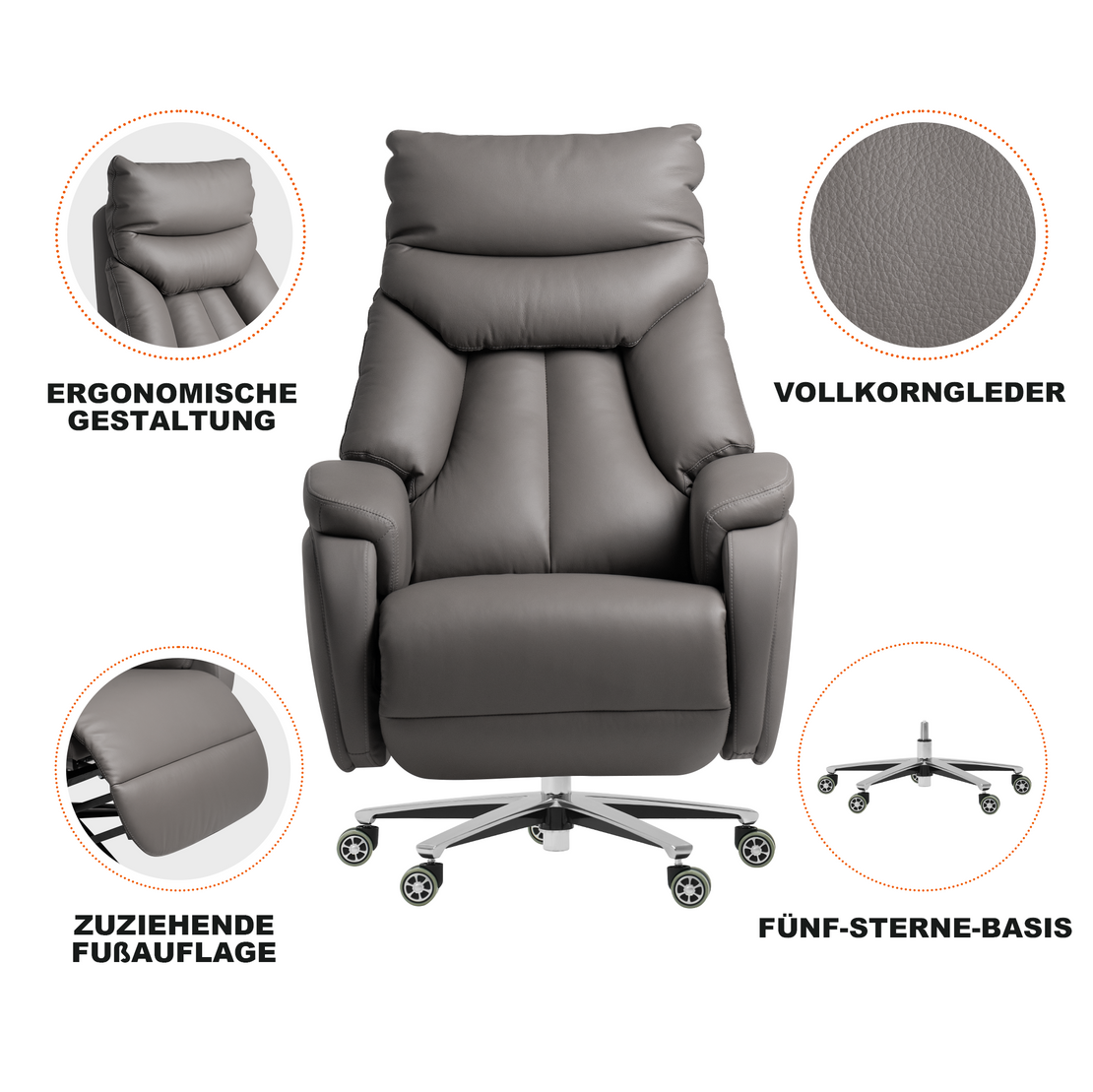 Der Bürostuhl überzeugt mit einer ergonomischen Gestaltung, hochwertigem Rindsleder, einer ausziehbaren Fußauflage und einer stabilen Fünf-Sterne-Basis. Die durchdachte Kombination aus Komfort, Materialqualität und funktionalen Details unterstützt ein angenehmes Sitzerlebnis im Büro oder Homeoffice. So verbindet das Modell modernes Design mit mehr Komfort im Arbeitsalltag.