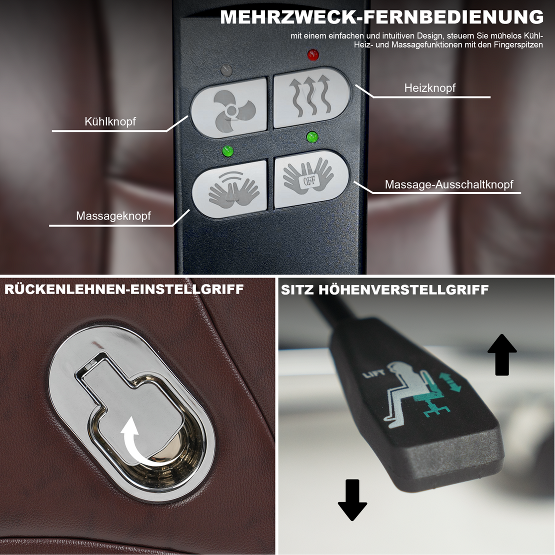 Die integrierte Fernbedienung ermöglicht eine einfache Steuerung von Massage-, Heiz- und Lüftungsfunktion. Ergänzt wird dies durch die manuelle Verstellung der Rückenlehne und die praktische Sitzhöhenverstellung. Alle Funktionen sind darauf ausgelegt, den Sitzkomfort im Büro und Homeoffice individuell anzupassen.
